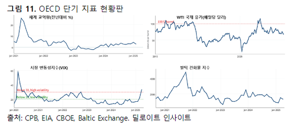 한편, OECD는 단기적으로 경기 신호를 보내는 주요 지표 현황판을 제공하는데, 여기에는 세계 교역량 변화, 국제 유가 추이, 변동성지수 수준, 화물 물동량 지표가 모여 있다.