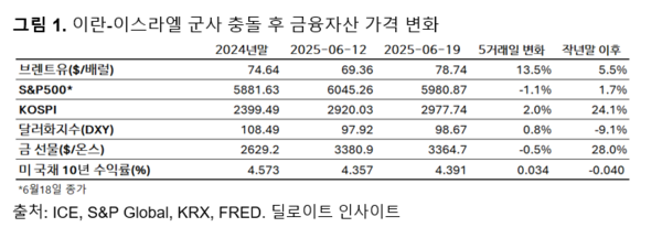 브렌트유 선물 가격은 2024년 말 대비 5.5% 오른 수준이다. 세계 경제의 저성장 장기화 추세 속에 수급 여건상 공급 초과로 인해 브렌트유 선물 가격은 올해 5월 초순에 배럴당 60달러 선이 무너지는 등 최근까지 작년 수준을 밑돌았다. 이번 이란-이스라엘 군사 충돌로 일시 급등했지만, 추가 상승 움직임은 제한적인 모습이다. 일단 현재로서는 이란의 정권 교체와 같은 중동의 균형 변화와 불안정이 국제 유가에 장기간 심각한 영향을 줄 수 있다는 견해가 지배적이다.