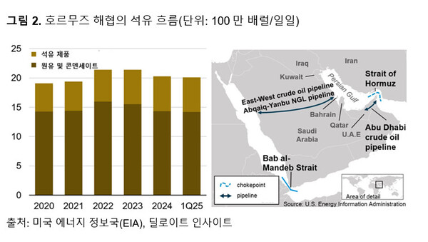 미국 에너지정보청(EIA)의 최신 정보에 따르면, 2024년 기준 호르무즈 해협을 통과하는 석유 제품 및 원유, 콘덴세이트 등은 하루 평균 2,000만 배럴(b/d)로, 전 세계 석유 액체 소비량의 약 20%에 해당한다. 2025년 1분기까지 이러한 규모가 유지됐다. 호르무즈 해협을 통해 이동한 원유와 콘덴세이트의 84%, 액화천연가스(LNG)의 83%가 아시아향이다. 중국, 인도, 일본, 한국이 해협을 통과하는 원유와 콘덴세이트 물량의 69%를 차지했다. 이들 국가가 호르무즈 해협의 공급 중단으로 가장 큰 영향을 받을 가능성이 높다.