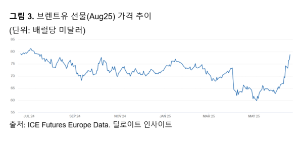 이번 사태가 발생하기 직전인 6월 12일 런던 거래소의 브렌트유 선물은 배럴당 69.36달러로 마감한 뒤 6월 13일 현지시각 새벽 들려온 이스라엘의 공습 소식에 한때 78.50달러까지 13% 이상 급등했지만, 이후 빠르게 안정을 찾으며 74달러 대로 후퇴했다. 하지만 19일 이스라엘이 이란에 대한 군사 작전을 확대하기로 결정하면서 다시 브렌트유 가격은 1월 22일 이후 최고치인 78.85달러로 반등해 불안한 양상을 드러냈다.