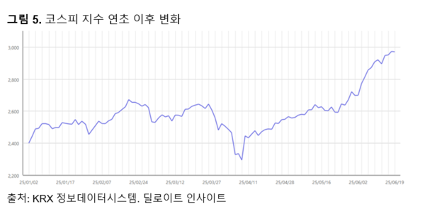 한국 코스피 지수(KOSPI)의 경우 이란-이스라엘 충돌 직후에 일시적으로 1.5% 하락했지만 이내 회복하여, 19일 종가 기준으로 2% 오른 2,977포인트를 기록했다. 코스피는 작년 말 종가에 비해 24% 넘게 상승했다. 4월 미국 관세 파동에 지수가 단기 고점 대비 13% 넘게 하락하기도 했지만 4월 9일 관세 부과 일시 중단 이후부터 꾸준히 상승하며 지수 3,000선에 접근하고 있다.