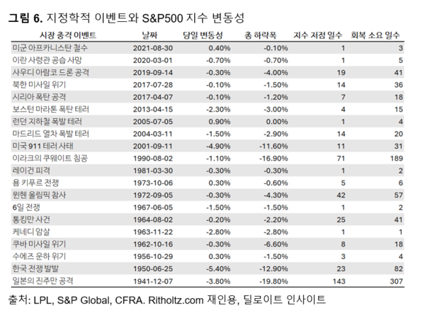 러시아의 우크라이나 침공 사태 발생 시점에도 S&P500 지수는 장중 3% 가까이 하락하다가 막판에는 상승 반전했다. 20세기 들어 양차 세계 대전을 제외하고는 주식시장의 펀더멘털에 근본적인 영향을 준 사건은 거의 없었다. 대부분의 지정학적 사건은 평균적으로 당일 시장에 약 1%가량 손실을 초래한 뒤 총 영향을 미친 기간 동안 5% 미만의 지수 하락율을 기록했다. 회복에는 좀더 오랜 시간이 걸리지만 그 기간은 생각보다 길지 않았다.