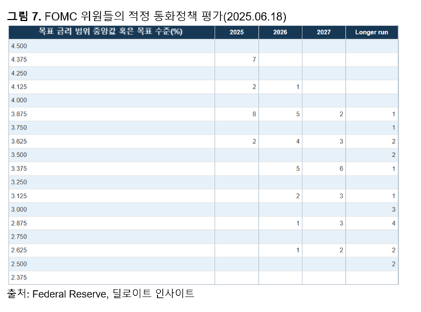 미국 연준은 6월 17일~18일 개최한 연방공개시장위원회(FOMC)를 통해 예상대로 기준금리를 4.25~4.50% 범위에서 동결했다. 이는 주로 미국의 관세 정책이 경제에 미치는 영향을 좀더 지켜보자는 입장에서 내린 결정으로 보인다. 이란-이스라엘 군사 충돌과 이에 따른 국제 유가 상승에 대해서는 별도의 견해를 밝히지 않았다.