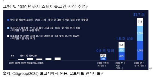 미국 씨티그룹은 2025년은 규제 변화에 힘입어 금융 및 공공부문에서 블록체인 채택의 '챗지피티 모먼트'(어떤 기술이 갑자기 기대 이상으로 대중적인 인지와 수용이 급격하게 늘어나게 되는 시점)가 발생할 것이라며, 스테이블코인 발행 규모가 오는 2030년까지 1.6조 달러(기본 전망)에서 3.7조 달러(낙관적 전망)에 이를 것이라고 전망했다. 기본 전망에 따를 경우 발행사의 미국 국채 보유 규모가 2030년까지 현재의 5~6배 수준인 1.2조 달러까지 증가할 것으로 예상된다.
