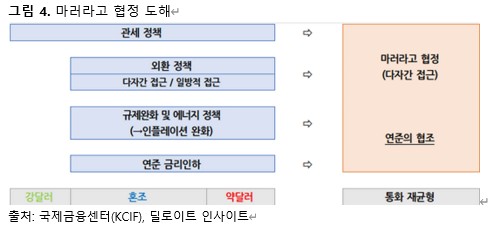 트럼프 정부의 경제 전략과 실행 방안은 언뜻 보기에는 그 자체로 모순적이다. 적극적인 감세 정책을 추진하면서도 재정은 긴축하고, 관세를 부과하면 인플레이션 압력이 높아지고 통화는 강세를 보이는 것이 일반적인 예상이지만 되레 달러는 약세로 만들겠다고 하고 그러면서도 달러화의 특권적인 지위는 절대 손상시키지 않겠다는 것이다. 트럼프 대통령은 지난해 대선 전 뉴욕경제클럽 연설에서 "달러화가 세계 통화의 지위를 잃는다면 전쟁에서 지는 것과 같다고 생각한다"고 말했다.