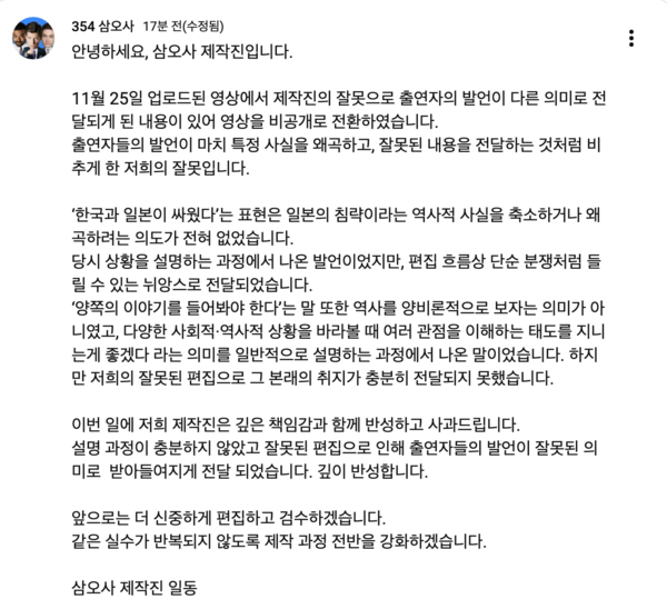 이후 제작진 측은 "25일 업로드된 영상에서 제작진의 잘못으로 출연자의 발언이 다른 의미로 전달되게 된 내용이 있어 영상을 비공개로 전환했다. 출연자들의 발언이 마치 특정 사실을 왜곡하고, 잘못된 내용을 전달하는 것처럼 비추게 한 저희의 잘못"이라고 하며 "'한국과 일본이 싸웠다'는 표현은 일본의 침략이라는 역사적 사실을 축소하거나 왜곡하려는 의도가 전혀 없었다. '양쪽의 이야기를 들어봐야 한다'는 말 또한 역사를 양비론적으로 보자는 의미가 아니었고, 다양한 사회적·역사적 상황을 바라볼 때 여러 관점을 이해하는 태도를 지니는 게 좋겠다 라는 의미를 일반적으로 설명하는 과정에서 나온 말이었으나 잘못된 편집으로 본래의 취지가 충분히 전달되지 못했다"고 사과했다.